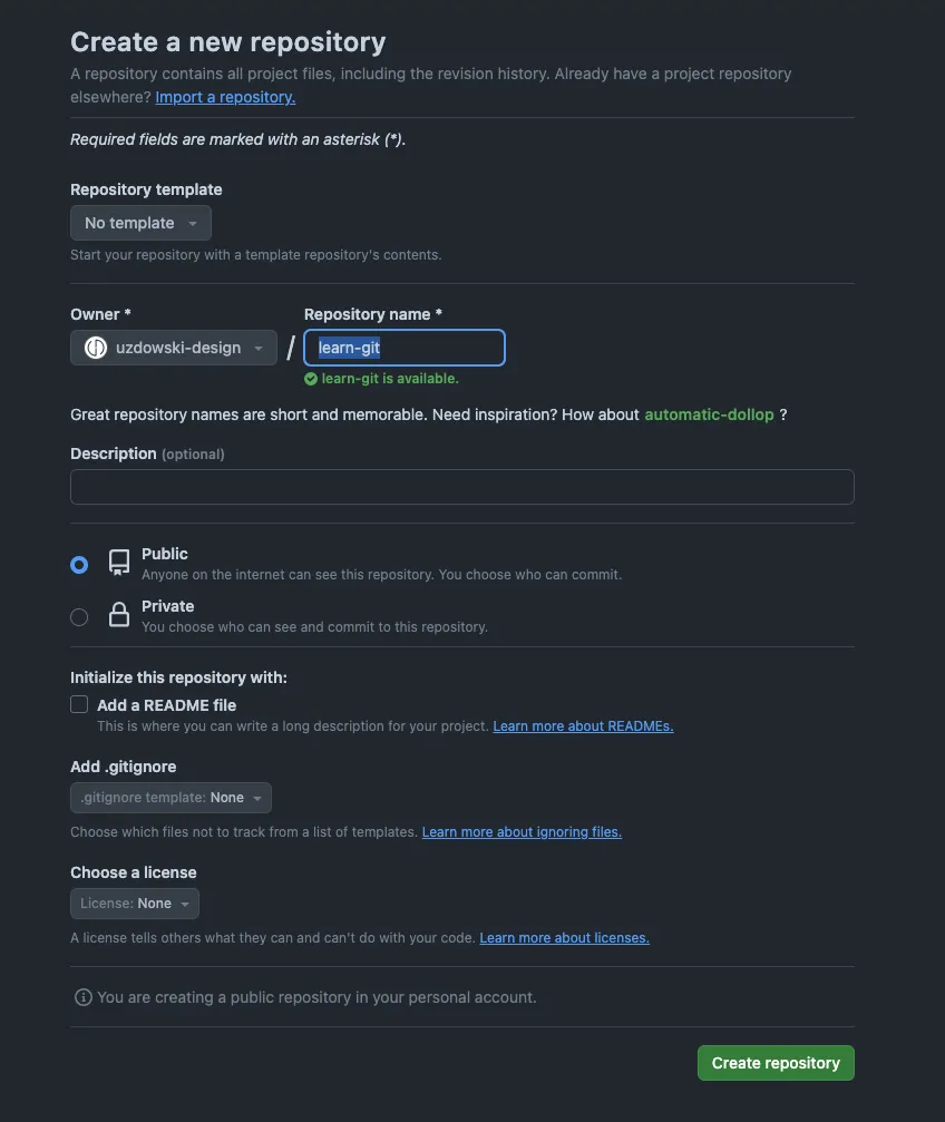 3.2 Fill in the repository name, description, and choose whether it’s public or private.