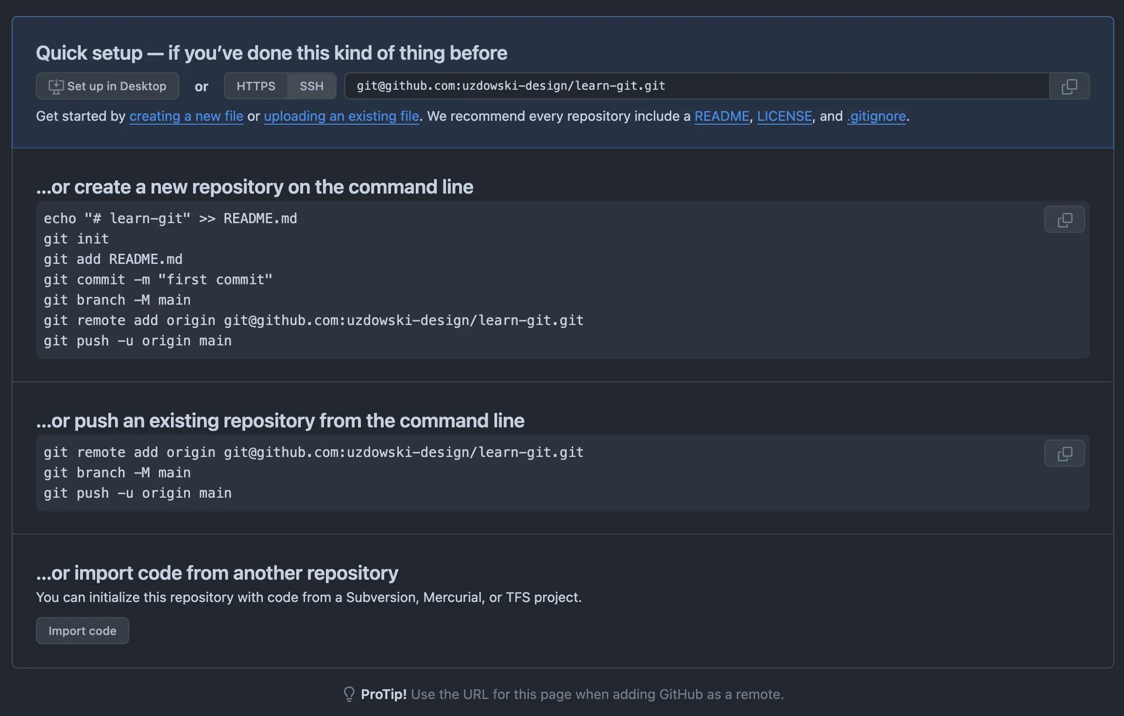 Use your new repo: Follow the on-screen instructions to use your newly created repository whether you are creating a brand new or pushing an existing one.